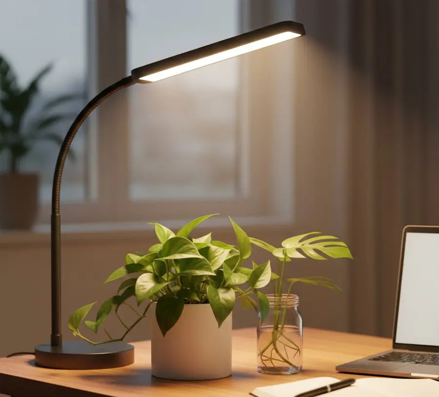 University extension resources generally support LEDs as a good option for indoor lighting when natural light is insufficient. Common household items like the eye-protecting desk lamps used on home desks are usually full-spectrum and are very suitable for plants. Therefore, if you place plants on your desk and turn on the lamp directly above them, the plants will thrive.