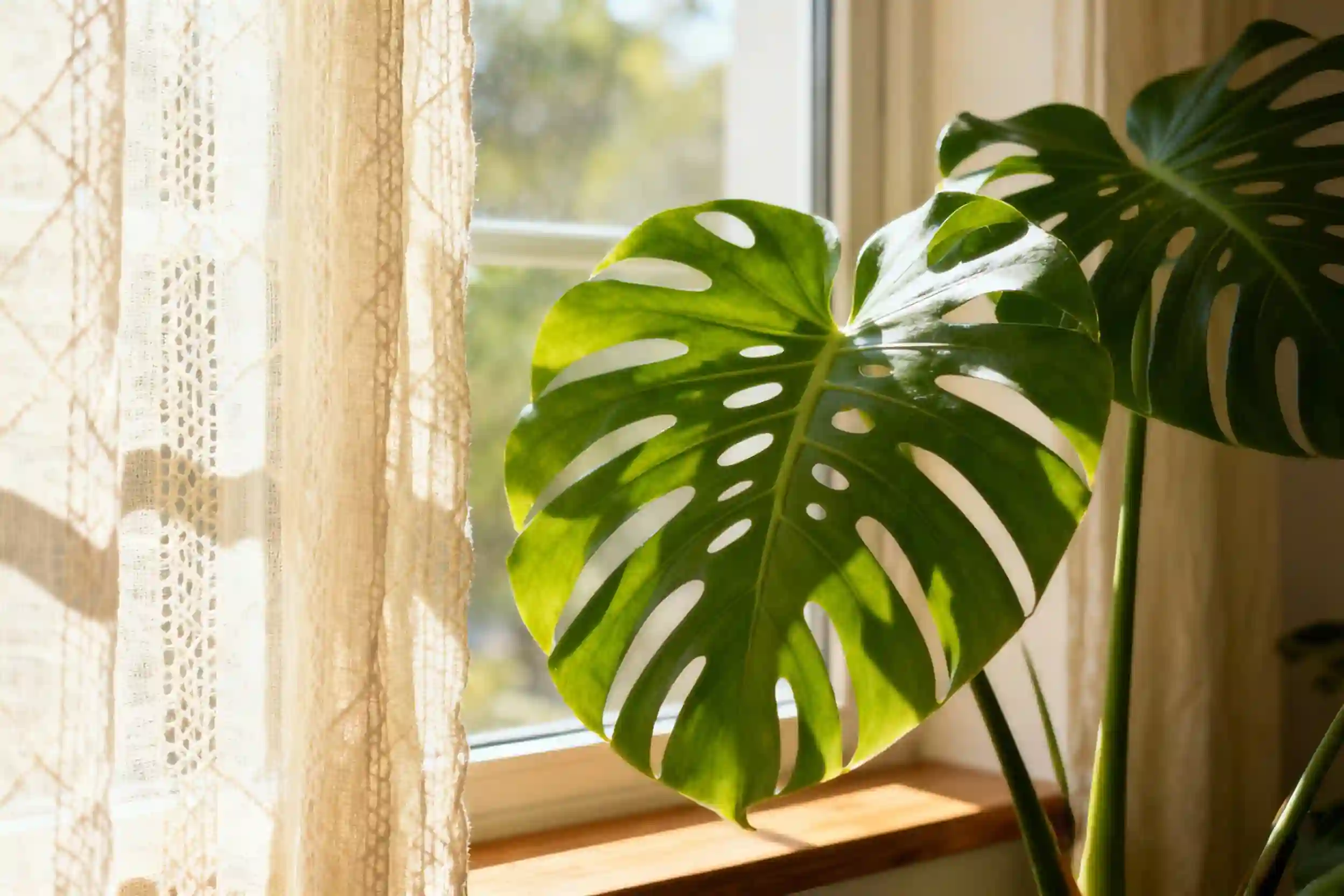 A sheer curtain is one of the easiest ways to create bright, indirect light for Monsteras. It softens harsh rays while keeping the room bright and plant-friendly. - Acclimate plants slowly if you move them outdoors.